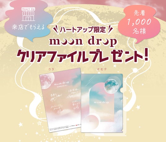期間中は先着にて「来店&クーポン提示」で限定クリアファイル、「学割で購入&クーポン提示」でここでしか手に入らない限定グッズをプレゼント。「ハートアップLINE友だち追加」で限定スマホ用壁紙が手に入る他、期間中キャンペーンサイトからの応募で、学生と一緒に作りあげるmoon drop限定プレミアムライブ(公開収録)へのご招待も行います。