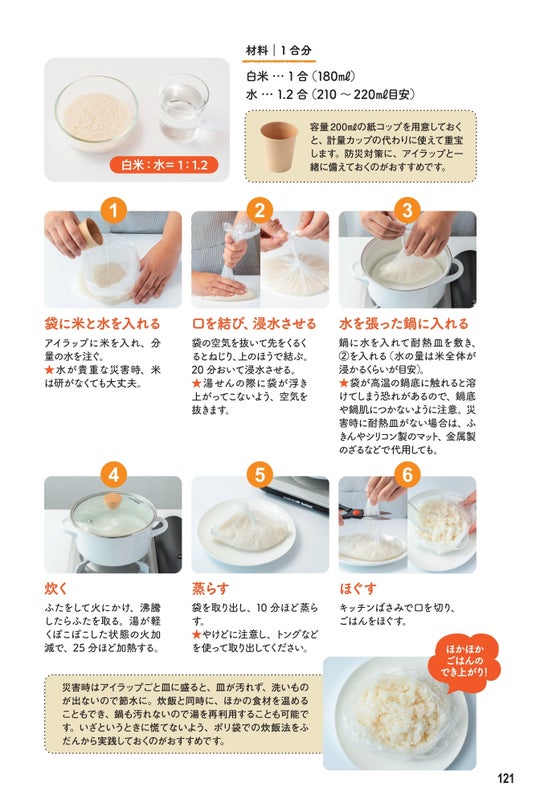 特に食料の準備について、電気や水道などライフラインが止まったときでも、カセットコンロがあれば温かい食事が食べられる「ポリ袋調理」に注目が集まっています。このたび、Gakkenでは『アイラップで簡単レシピ』(2024年5月発売)から防災に関する情報・レシピを無料公開いたします。「アイラップ」を活用した炊飯法のほか、備蓄品とアイラップでできるレシピを紹介します。
