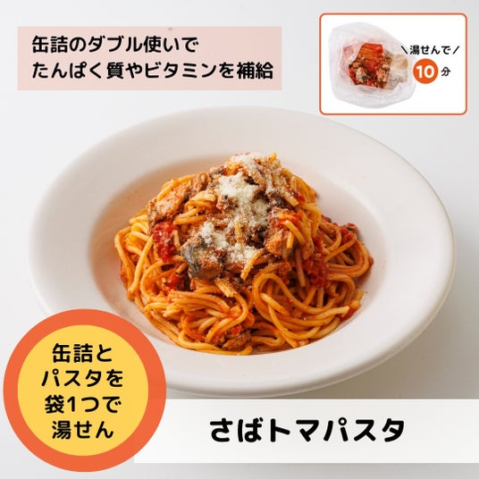 ・アイラップ×備蓄食材レシピ1.缶詰でタンパク質やビタミンを補給!「さばトマパスタ」