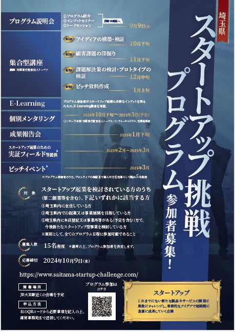 このたび、サロン開設に先立ち、スタートアップ起業希望者等を対象とした「埼玉県スタートアップ挑戦プログラム」を実施します。