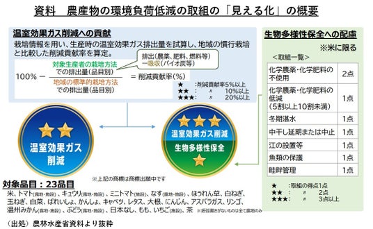 農林水産省では「みどりの食料システム戦略(*1)」に基づき、持続可能な食料システムを構築するため、食料システム全体での環境負荷低減の取組や国民理解の醸成に向けて、環境負荷低減の取組の「見える化」を推進しています。 ガイドラインに基づき、「温室効果ガス削減への貢献」や「生物多様性の保全」の取組を分かりやすく等級ラベルで表示することで、生産者の環境負荷低減の努力が消費者に伝わり、農産物を選択できる環境を整えていきます。今回評価された八百結び(R)の農作物にも今後等級ラベルが表示されます。