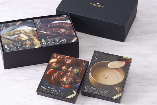ご自宅で気軽に本格的なホテルの味をご堪能いただけるシェフズセレクション4種。(左奥:グリーンカレー、右奥:ブラックカレー、左手前:ビーフシチュー、右手前:コーンスープ)