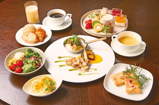 メインプレートには、香草バター焼きにしたサーモン&ホタテと、低温でじっくりと焼き上げた大阪のブランド豚・なにわポークが。前菜、サラダ、デザート、スープ、ドリンクはブッフェ形式。