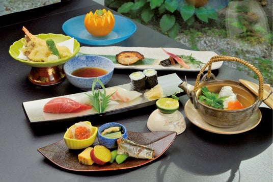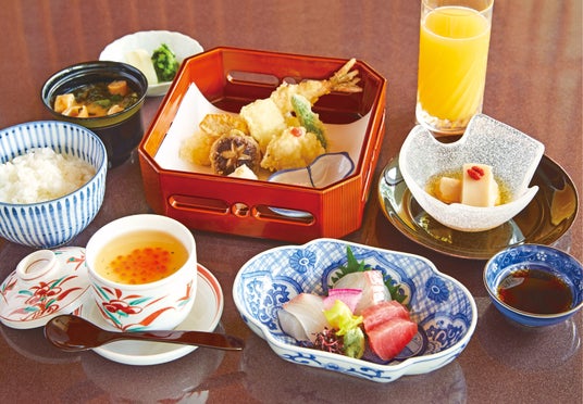 和歌山県産のマグロが入ったお造り、秋ならではの名残鱧の天ぷらなど、旬の魚がたっぷりと盛り込まれた特別なランチ。窓の外に広がる日本庭園を眺めながら、じっくりと堪能することができます。