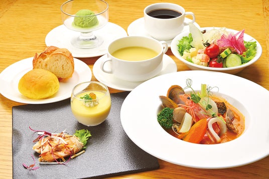 メインは、スズキやアカエビ、アサリ、イカのうま味がたっぷりの一品。サラダとスープはブッフェスタイルで楽しめます。ドリンクとアイスアイスクリームもセットに。※10月にはメインが変わります。
