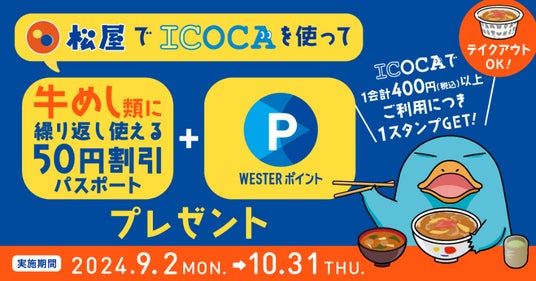 このたび松屋フーズ(本社:東京都武蔵野市、代表取締役社長:瓦葺一利)では、牛めし・カレー・定食・その他丼の「松屋」におきまして、2024年9月2日(月)より、西日本旅客鉄道株式会社(本社:大阪府大阪市、社長:長谷川一明)が提供するICOCA決済でご利用のWESTER会員の皆様に、WESTERアプリにおいてスタンプを進呈し、スタンプ数に応じて“期間中牛めし類に使える値引きパスポート”や“WESTERポイントを進呈する「松屋でICOCAを使って牛めし割引パスポートをもらおう!キャンペーン」を実施いたします。