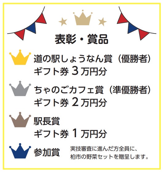 - 応募作品の著作権は、全て主催者に帰属することとします。応募用紙、写真は返却しません。実技審査に 選ばれた作品は、道の駅しょうなん内「ちゃのごカフェ」のメニューとして販売される可能性もございます。