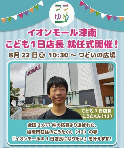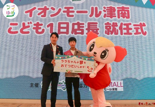 株式会社イオンファンタジー(代表取締役社長:藤原徳也、所在地:千葉県千葉市、以下、当社)は、モーリーファンタジーのキャラクター“ララちゃん”が夢を叶えるおてつだいをする企画 「ララゆめ ~ララちゃんが夢をおてつだいします!~」で2,677件の応募の中から選ばれた、三重県松阪市 こうたくん(12歳)の「イオンモールの1日店長になりたい。」という夢を8月22日(木)にイオンモール津南にご協力いただき叶えました。