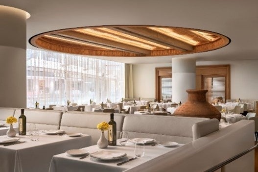 レストランの見事なインテリア・デザインは、ギリシャの象徴的な建築と文化からインスピレーションを得ており、まるで地中海の中心部にいるかのような体験を味わうことができます。