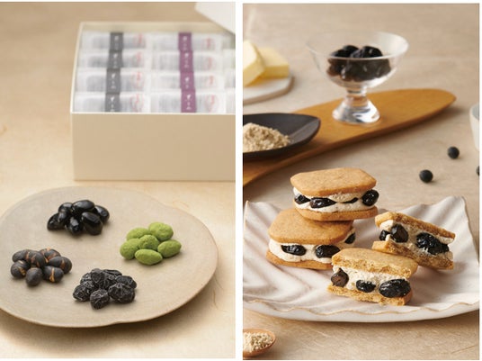 大阪・黒門発祥の〈善祥庵〉は、黒まめの最高品種「丹波黒大豆」にこだわり、さまざまな食感と味わいに仕上げた黒まめ菓子の専門店です。じんわりと心にしみる滋味ゆたかなお菓子を揃えました。黒まめきな粉のクッキーでクリームと黒まめを挟んだバターサンド「生かさね」は東京初出品です。