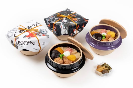 販売開始から60余年、皆様から愛されている荻野屋の人気商品「峠の釜めし」に、ヤノベケンジ氏が描く「BIG CAT BANG」イラストを使用した掛け紙をかけた限定商品です。峠の釜めしの特徴である益子焼の器は、イラストの世界観に合わせ特別カラーをご用意しました。販売時期により、異なった掛け紙と特別カラーの釜をお楽しみいただけます。