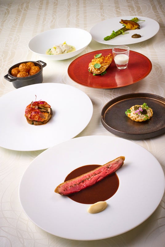 今回の就任記念スペシャルディナーのメインディッシュは「七谷鴨(ななたにかも)のロースト フィナンシエール風赤ワインのソース」。川本が自ら足を運び選んだ七谷鴨は、京都の自然の中で飼育環境や飼料にこだわり育てられた高い品質を誇る合鴨で、旨味が濃くジューシー、脂も甘いことが特長です。その鴨肉のローストに、フォアグラやトリュフを使用した芳醇な赤ワインソースを添えて、肉の深みをお楽しみいただける一皿に仕上げました。前菜や魚料理にも、鮑や鱧・オマール海老といった食材を使用しており、それぞれの素材の旨味と調和をご堪能いただけます。
