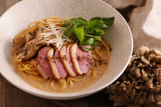 ジューシーな合鴨と、旨味たっぷりの舞茸が食欲をそそる和パスタ。