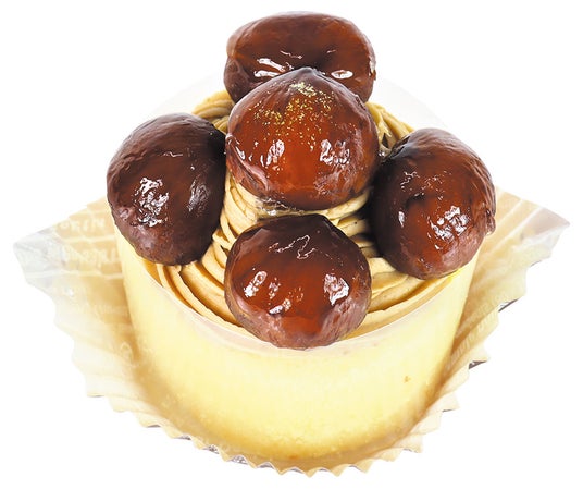 軽いタイプのカスタードクリームを巻いたロール生地に、洋酒で風味をつけたマロンペーストを絞りました。上面に渋皮付栗甘露煮を5粒飾った、栗好きにはたまらない一品です。