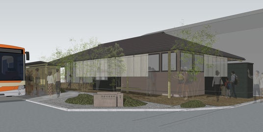 店舗外観は、周囲との調和とともに、暖簾の揺らめきや深い軒がつくる影の動きにより、ゆったりとした時間の流れを感じられるデザインとし、バウムクーヘンを焼く工房の様子をガラス越しに楽しむこともできます。また、店舗前には新たな屋根付き待合スペースを設けるほか、お手洗いも増設・リニューアルすることで、バスのりばとしての快適性も一層向上します。