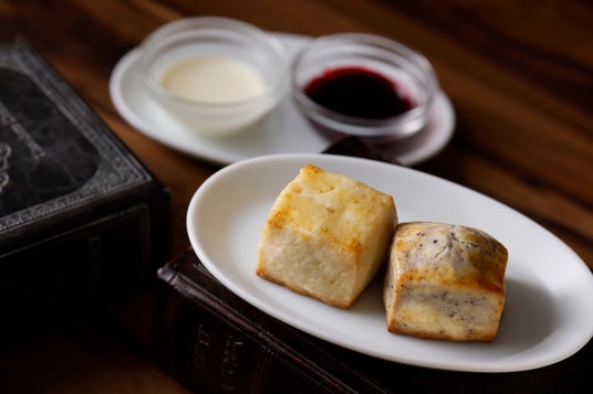 プレーンスコーンとブルーベリースコーンの2種類。クロテッドクリームとブルーベリージャムを添えてお召し上がりください。