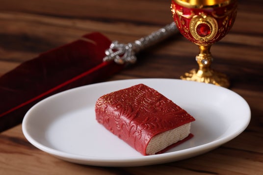 古代の魔法薬の教科書を模したマロンクリームケーキ。ふわふわのスポンジ、マロンクリーム、チョコで教科書を表現し、金箔パウダーで仕上げました。