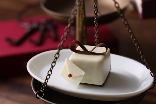 チョコムースで形作られた謎の贈り物。チョコレートでできたリボンとメッセージカードが添えられ、中身がわからない贈り物を開けるワクワク感が楽しめます。