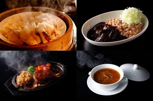 左上より時計回りに「北京ダック」、「銀座ビーフカレー」、「ズワイ蟹入りふかひれ五目スープ」、「特製ソース(カイマナ風ビーフステーキスタイル)」