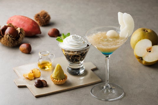 秋のBar19は、梨や栗、芋を主役に実りの秋を感じるカクテル2種をご用意いたします。フレッシュの梨1個分を贅沢に使ったカクテル「梨丘(りきゅう)」は、すりおろした梨の瑞々しい甘みと、ジンの爽やかな香りが絶妙に調和し、グラスに添えた梨の果肉がさらに芳醇な香りを引き立てる一杯です。はじめのひと口は混ぜずにそのままで梨の味わいを楽しみ、グラスの底に沈めたブルーキュラソーを混ぜると色が変化し、少し甘み感じる一杯になります。期間中、爽やかな味わいの20世紀梨や甘み豊かな西洋梨など季節の梨を使うので、訪れるたびに異なる味わい楽しめるのもこのカクテルの魅力です。「AUTUMN HARMONY(オータム ハーモニー)」は、コーヒーゼリーと栗のリキュールを使った、デザート感覚で楽しめる食べるカクテル。焼き芋焼酎を合わせた芋のペーストやチップスを飾るとパフェ風に。お好みでチョコレートラムをかければ、カカオの香りとラム酒のほろ苦さが加わり大人の味わいに変化します。