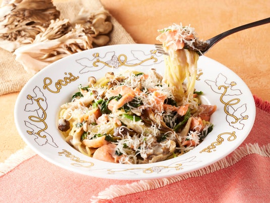 「~トリュフ香る~サーモンと2種きのこのクリームパスタ」は、トリュフオイルとトリュフ塩で下味を付けたコクのあるサーモンと、舞茸やしめじの旨みが食欲をそそる一皿です。クリームソースには、トリュフの香りやマッシュルームの旨みをたっぷり詰めこみました。