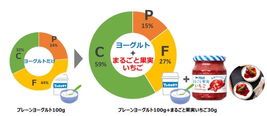 【比較例】1.プレーンヨーグルト100g単体、2.プレーンヨーグルト100g+「アヲハタ まるごと果実 いちご」30gでのPFCバランスを比較。2.の方が、より理想的なPFCバランスに近づくことがわかりました。※3