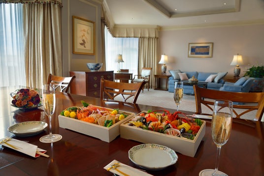 本プランでは、12月31日ご宿泊のお客様には、大晦日の夜に年越しそばをお部屋でお楽しみいただき、元旦のご朝食には料亭「錦水」のおせち(二段重/1室1台/4名様分)とお雑煮(人数分)をお部屋にお届けする、ホテルにいながら年末年始のひとときを満喫できる内容となっております。