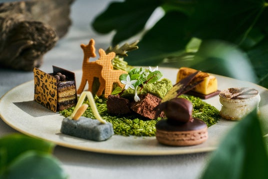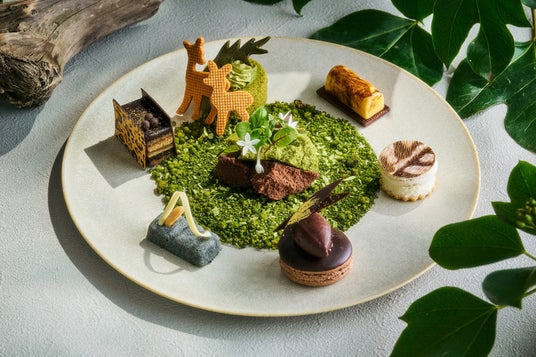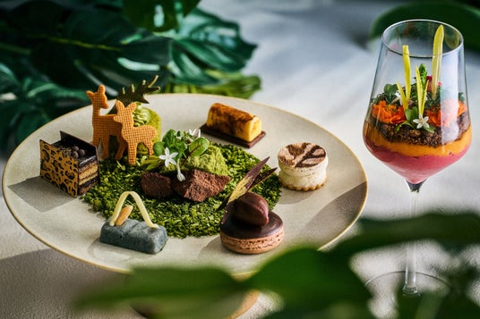 野生動物をコンセプトにしたスイーツプレートには、草原の周りにヒョウ柄のオペラや毛並みがリアルなゼブラ柄のココナッツバニラサンドのほか、草むらで過ごす鹿の親子をクッキーとピスタチオケーキで表現したケークピスターシュなどが並びます。プラントベースの食材で作るセイボリーは、キャロブ豆のクランブルで土を表現したヴィーガンフムスと豆乳クリームチーズを使ったスパイシーヴィーガンタコスのいずれかをお選びいただけます。