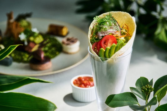 野菜と豆乳クリームチーズを合わせたタコスです。サルサソースで味を