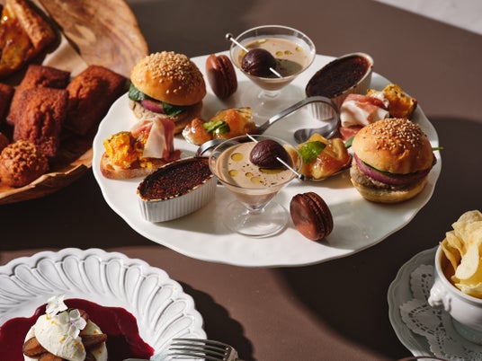 『マロンのオータムアフタヌーンティー 』は、Seasonal Premier Plate/プルミエプレート(季節の一皿)に、南瓜とクミンシードのマスカルポーネで和え、生ハムとはちみつで加えた“クミン香るかぼちゃと生ハムのカナッペ”、“鴨コンフィバーガー”、ラム酒が香る“栗の冷製ポタージュglassスープ”、スパイスでじっくりコンポートしたリンゴに秋が旬のいちじくゼリーをかけた“いちじくとリンゴのコンポートのゼリー”、濃厚なマロンをブリュレ仕立てした“マロンブリュレ”、“ショコラマカロン”をご用意。