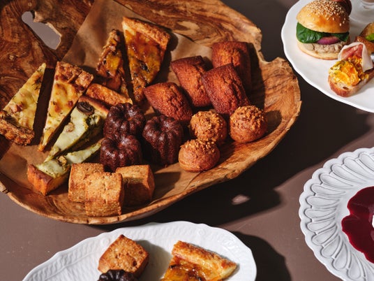 お客様の目の前までお運びするBake Wagon/ベイクワゴンは、“カヌレ“、”シューパリジャン“、りんごをガレットとして焼き上げた”季節のフルーツのガレット(りんご)“、”フィナンシェレーヌ“、”スコーン“、”キッシュロレーヌ“、”チキンジェノベーゼのブリオッシュタルト”の全 7 種類の中からお好みの焼菓子(キッシュ含む)を 4 種類その場でお選びいただけます。