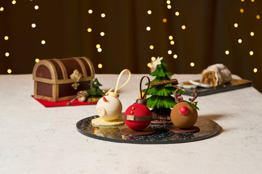ツリーに飾るオーナメントをチョコレートで表現。オーナメントの中には、それぞれ異なるフレーバーのピーカンナッツが入っています。