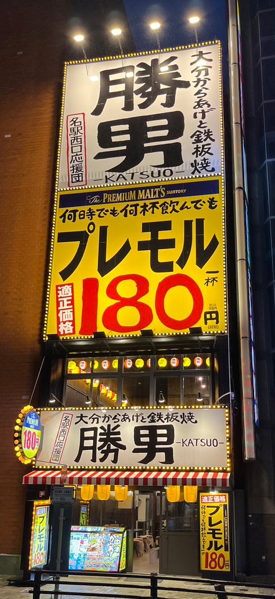 勝男はお財布に優しくコスパ最強の庶民派居酒屋で、長年大阪で頑張ってきました。2011年の勝男創業時から生ビール一杯180円を掲げて十数年、「格安生ビール居酒屋の元祖」として満を持しての東海地方名古屋初出店となります。本物の価格と本当の美味しさをウリに、これまで大阪・関西そして東京等で愛されてきた勝男、今後は名古屋そして東海地方の方々にも、あの「勝男」だ!と可愛がっていただけるよう、まずは名古屋の駅前から勝男の歴史をつくっていきたいと考えております。