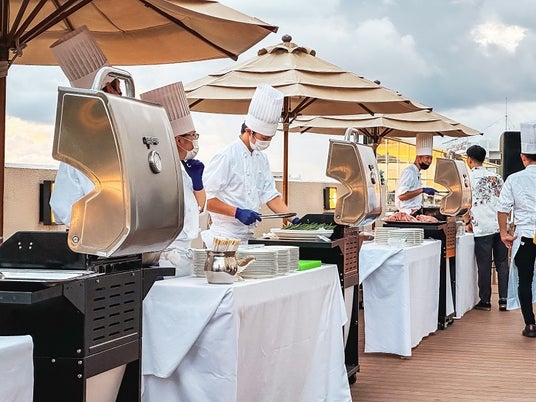 イベント会場はインフィニティプールに隣接する開放的なBBQテラス。夕暮れから夜にかけてのパノラマビューに包まれながら、シャンパンに合う和洋メニューの数々とシェフズグリヤードのワイルドな肉料理でお楽しみしください。