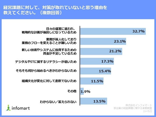 前問で「あまり感じない」「全く感じない」と回答した方に、対策が取れていないと思う理由を聞いてみると(n=52)、第1位は「日々の運営に追われ、戦略的な計画が後回しになっているため(32.7%)」、第2位は「業務が属人化しており、業務のフローを変えることが難しいため(23.1%)」、第3位は「新しい技術やシステムに投資するための資金が不足しているため(21.2%)」となりました。