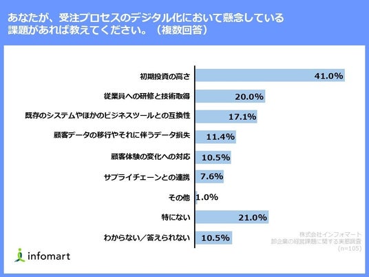 受注プロセスのデジタル化において懸念している課題について聞いてみると(n=105)、「初期投資の高さ」が41.0%で最多となりました。粗利が低いことが経営課題になっていることもあり、コスト面での導入ハードルが高いようです。