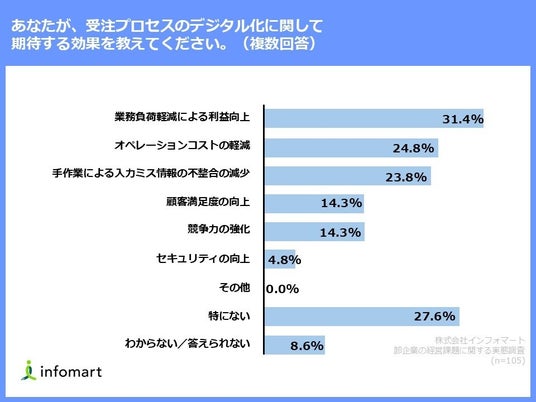 - 受注プロセスのデジタル化に期待する効果、第1位は「業務負荷軽減による利益向上」
