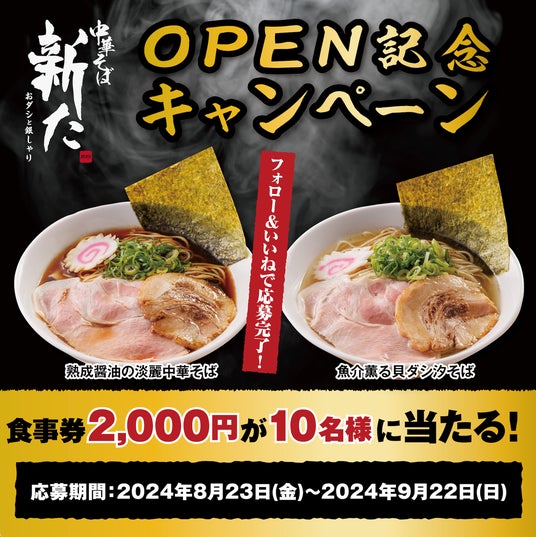 『おダシと銀しゃり 中華そば 新た』(住所:神奈川県平塚市)を2024年9月3日(火)にオープン致します。