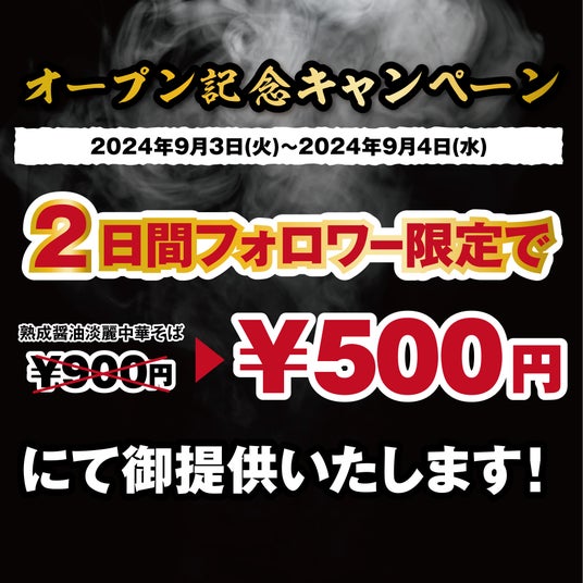 1.Instagram公式アカウントをフォローした方限定で、2024年9月3日(火)~2024年9月4日(水)の2日間で「熟成醤油 淡麗中華そば(¥900)」をワンコイン500円でプレゼント!