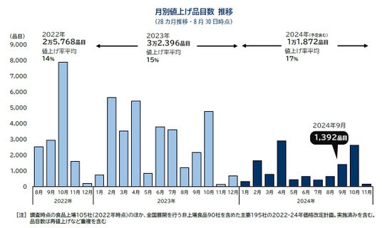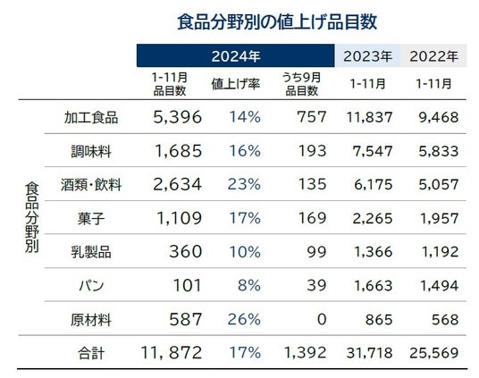 2024年通年の値上げ品目数(予定含む)は11月までの累計で1万1872品目となり、年間の平均値上げ率は17%となった。また、10月は6カ月ぶりに2千品目を超える水準で推移しており、今年4月に次いで年内2番目に値上げ品目が多い「ラッシュ」となる。