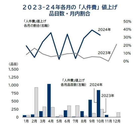 ただし、値上げの沈静化傾向が強まった前年同月(2148品目)に比べると756品目(35.2%)少なく、9カ月連続で前年同月を下回ったほか、減少率は9月までで年内最小となった。また、1回あたりの平均値上げ率は9月単月で16%だった。