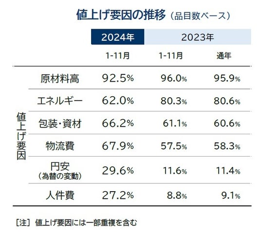 2024年の値上げ要因では、最も多いのが「原材料高」(92.5%)となった。年前半では割合が小さかったものの、猛暑や干ばつ、流通ルートの制限により一部原料で価格上昇の影響を受けたことが要因となった。円安ドル高の影響が長期化していることを背景に、「円安」要因の値上げは29.6%を占めた。「人件費」由来の値上げは27.2%を占め、23年通年(9.1%)を大きく上回る水準が続いた。最低賃金の引き上げなどによる従業員の「賃上げ」を要因とした値上げが徐々に製品価格へ反映・浸透しはじめたことも要因の一つとみられる。