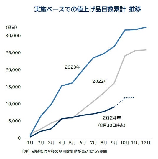 株式会社帝国データバンクは、2024年9月以降における食品の値上げ動向と展望・見通しについて、分析を行った。
