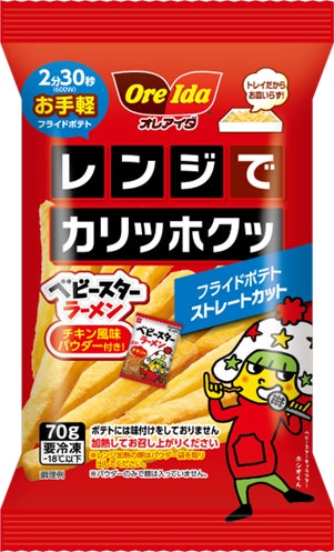 新商品の冷凍フライドポテト2品は、「オレアイダ レンジでカリッホクッ フライドポテト ストレートカット 70g ベビースターラーメンチキン風味シーズニング付き」、「オレアイダ レンジでカリッホクッ フライドポテト ストレートカット120g ベビースタードデカイ焼そば ソースマヨ風味シーズニング付き」です。「オレアイダ」ブランドのレンジポテトシリーズは、トレーのままレンジで加熱するだけでカリッホクッとした食感のおいしいフライドポテトができる手軽さから、人気の商品となっています。新商品では、定番のストレートカットのフライドポテトに、レンジ加熱後、付属のベビースターコラボのシーズニングパウダーをかけると、いつものポテトが簡単に味変できます。チキン風味パウダーは、発売以来ロングセラー商品の「ベビースターラーメンチキン味」を表現し、チキンと野菜のうまみ豊かな味わいです。ソースマヨ風味パウダーは、「ベビースタードデカイ焼そばソースマヨ味」を表現し、トロッと濃厚なソース味にほどよい酸味のあるマヨネーズ風味で、甘み・コク・香ばしさが後引く味わいです。いずれもベビースター人気の2つのフレーバーで、おやつだけでなく、おつまみにも最適です。