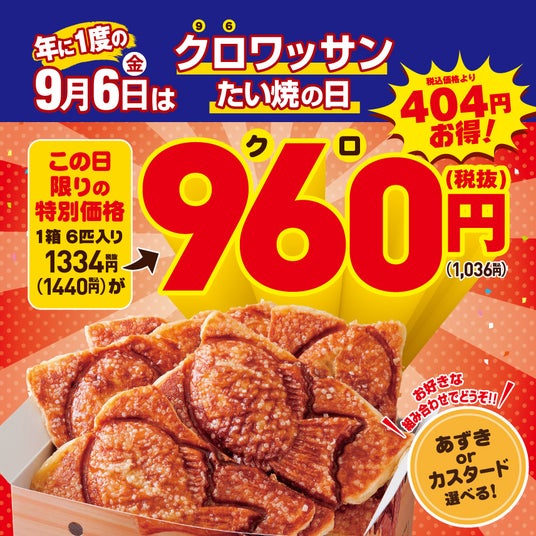 築地銀だこ https://www.gindaco.com/ ・銀のあん http://www.ginnoan.com/ を展開する株式会社ホットランド https://www.hotland.co.jp/ (本社:東京都中央区、代表取締役社長:佐瀬守男)は、2024年9月6日(金)、9と6(クロ)= 『クロワッサンたい焼の日』 を記念し、全国の築地銀だこ・銀のあんのクロワッサンたい焼取扱店舗(一部店舗除く)で 「クロワッサンたい焼6匹入りセット」 を、 「クロ(96)」 にちなみ、1箱6匹入り960円(税抜) / 1,036円(税込)の特別価格で販売いたします!