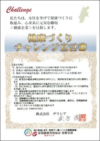 ※「健康づくりチャレンジ宣言」とは、事業所全体で健康づくりに取り組むことを宣言し、実施することで心身ともに元気な職場《健康企業》を目指すことです。(全国健康保険協会 長野支部ホームページ抜粋)