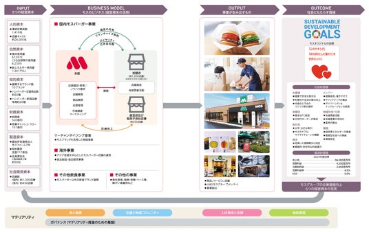 モスグループの価値創造モデルとともに、マテリアリティの4つのテーマごとの推進責任者や2024年度のアクションプラン、SDGsゴールとの関連などを掲載