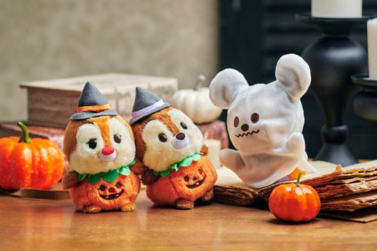 「うるぽちゃちゃん」からハロウィーン仕様のミッキーマウス、チップ&デールのぬいぐるみが登場します。いたずら好きのミッキーは、おばけに扮してみんなを驚かせようとしているキュートなデザイン。チップ&デールは、かぼちゃととんがり帽子でおめかししています。この時期だけの愛らしいぬいぐるみで、ハロウィーンシーズンを楽しめます。