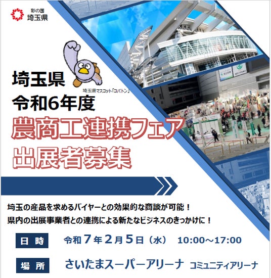 新たなビジネスチャンスの創出を目的に、県内の農業者や食品関連事業者と、首都圏バイヤー等が商談や情報交換を行う「埼玉県農商工連携フェア」を開催します。