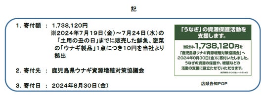 マルエツは、ウナギ資源保護活動を支援するため、「土用の丑の日」に向けて販売しました「ウナギ蒲焼」をはじめとするウナギ製品1点につき、10円を当社より拠出し、下記の通り「鹿児島県ウナギ資源増殖対策協議会」へ寄付いたしましたので、お知らせいたします。
